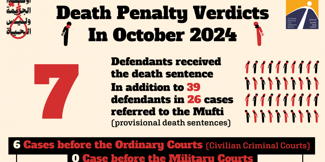 During the month of October 2024, Egyptian courts issued death sentences to 7 defendants in 6 cases. Among them, 1 was issued final verdicts that could not be appealed. Additionally, 39 defendants' papers were referred to the Grand Mufti in 26 other cases.