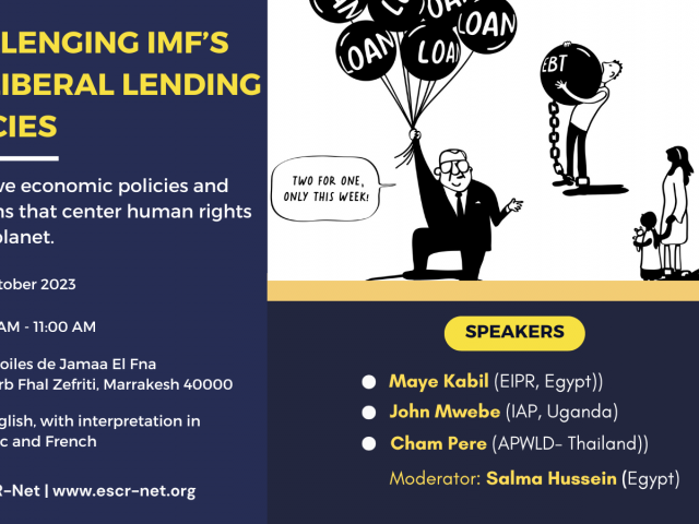 EIPR is represented in Marrakech meetings by Maye Kabil, senior researcher at the Economic and Social Justice Unit, and Dr. Ayman Sabae, senior researcher on the right to health. They coordinate several events in collaboration with partners, including the International Network for Economic, Social, and Cultural Rights (ESCR-Net), the Transnational Institute (TNI), and others. These events include a seminar entitled "Challenging IMF's Neoliberal Lending Policies", which will be held on the morning of 13 October. The seminar will address the role of IMF policies in deepening the debt crisis and will seek to explore alternative economic policies and paradigms that center on human rights and the planet. Another seminar will be held on the same day under the title "Corporate Capture and the Role of Corporations in Debt and Climate Crises in the Global South".