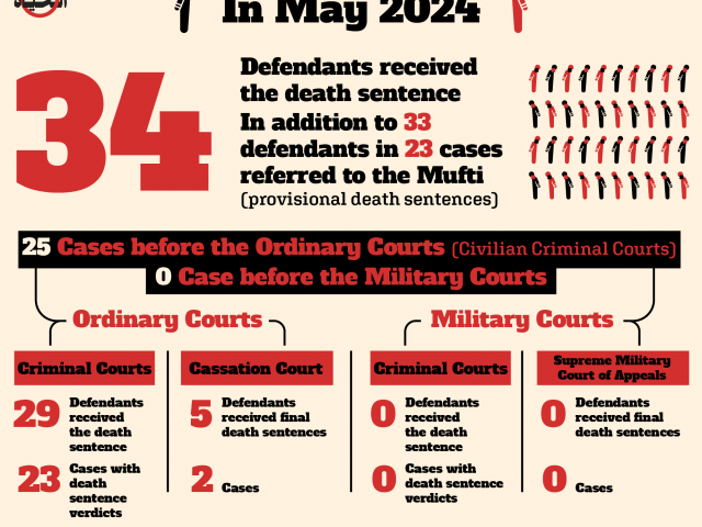 During the month of May, Egyptian courts issued death sentences to 34 defendants in 25 cases. Among them, 5 were issued final verdicts that could not be appealed. Additionally, 33 defendants' papers were referred to the Grand Mufti in 23 other cases.