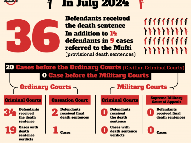 During the month of July, Egyptian courts issued death sentences to 36 defendants in 20 cases. Among them, 2 were issued final verdicts that could not be appealed. Additionally, 14 defendants' papers were referred to the Grand Mufti in 9 other cases.