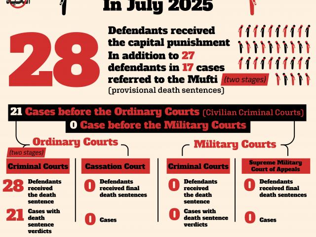 During the month of July, Egyptian courts issued death sentences to 28 defendants in 21 cases. Additionally, 27 defendants' papers were referred to the Grand Mufti in 17 other cases.