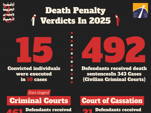Meanwhile, criminal courts at both first instance and appeal levels issued death sentences against 461 individuals in 320 cases, in addition to referring the case files of 405 defendants in 260 cases to the Grand Mufti of the Republic for a “religious” opinion on their execution.