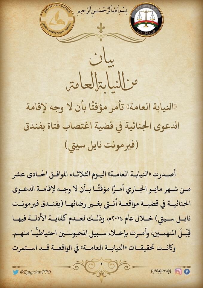 تأسف المنظمات الحقوقية والنسوية السبع الموقعة على هذا البيان لقرار النيابة العامة المعلن في بيان في ساعة متأخرة مساء أمس الثلاثاء 11مايو 2021، والذي أعلنت فيه غلقها للتحقيقات في جريمة الاغتصاب الجماعي التي وقعت في فندق فيرمونت عام 2014، وإخلاء سبيل المتهمين المحبوسين على ذمة تلك القضية، بناء على قرارها بألا وجه لإقامة الدعوى في هذه القضية مؤقتًا.