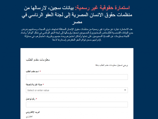 الاستمارة متاحة على الرابط التالي وهي بعنوان "استمارة حقوقية غير رسمية: بيانات سجين، لإرسالها من منظمات حقوق الانسان المصرية إلى لجنة العفو الرئاسي في مصر":