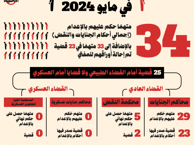 خلال شهر مايو أصدرت المحاكم المصرية أحكامًا بالإعدام على 34 متهمًا، في 25 قضية، منهم 5 متهمين كانت الأحكام الصادرة ضدهم نهائية وغير قابلة للطعن، فضلًا عن إحالة أوراق 33 متهمًا للمفتي في 23 قضية أخرى