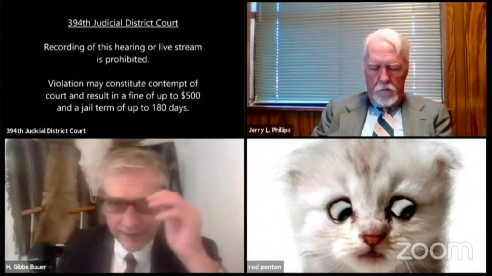 في الواقعة الأولى دخل أحد المحامين إلى جلسة محاكمة افتراضية منعقدة عن بُعد في محكمة جزئية بولاية تكساس الأمريكية، ولم ينتبه إلى أنه كان قد قام بتفعيل "فلتر" أظهره في شكل قطة منزلية. ويبدو أن السبب في ذلك كان تفعيل واحد من أطفاله في وقت سابق للفلتر على تطبيق الاتصال عن بُعد المستخدم للمشاركة في الجلسة الافتراضية. وقد فشل المحامي في تعديل الوضع أو إلغاء الفلتر المستخدم لعدة دقائق، وبدا عليه التوتر ما دفعه لأن يقول "أؤكد لك سيادة القاضي أنني محاميًا ولست قطًا"، وهي الجملة التي خلدت هذه الواقعة - حتى ساعده رئيس الجلسة بنفسه في إرشاده لكيفية إلغاء تلك الخاصية على تطبيق زووم.