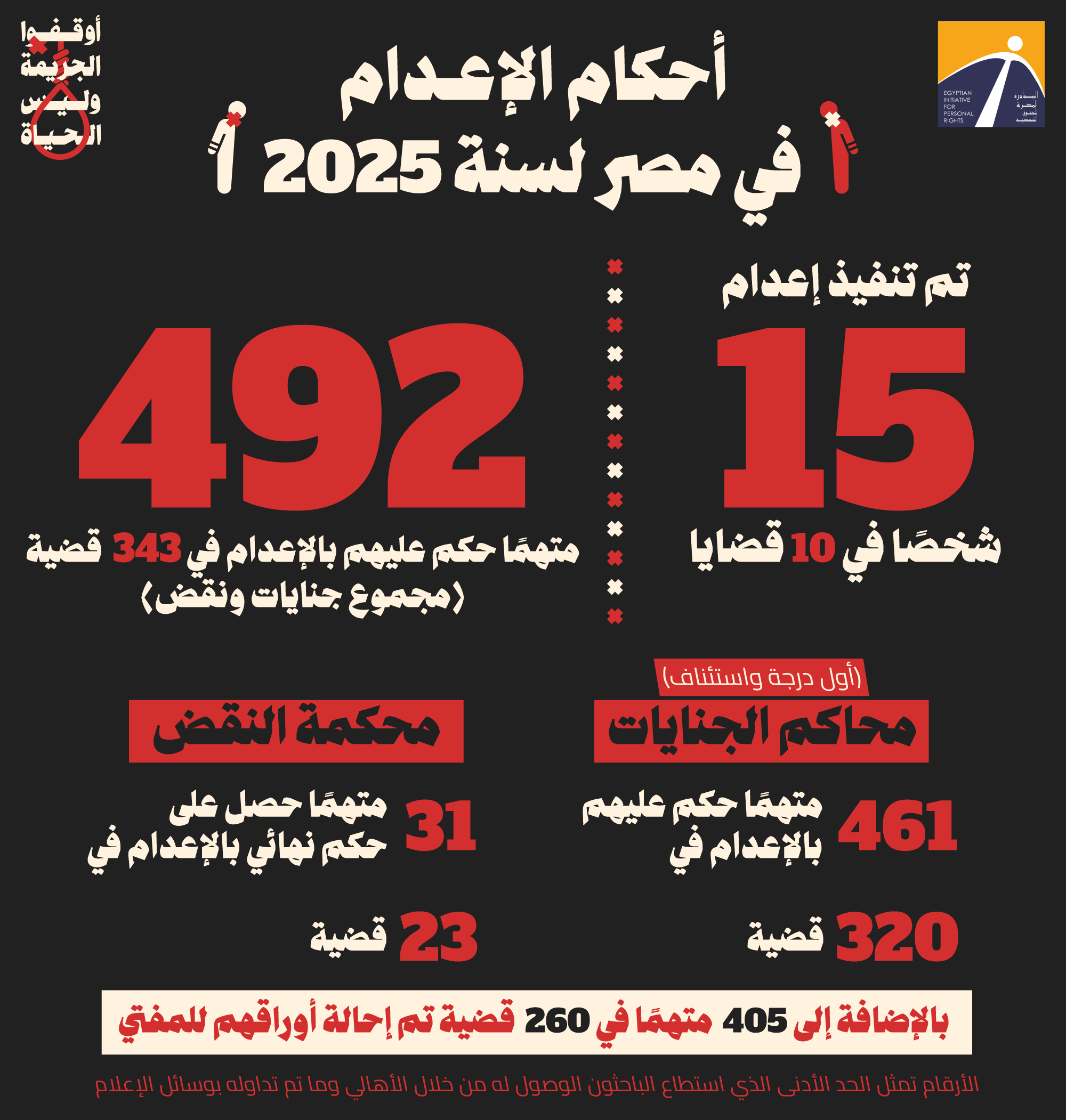 خلال عام 2025، نفذت مصلحة السجون المصرية حكم الإعدام شنقًا على 15 شخصًا على الأقل بينهم امرأة واحدة موزعين على 10 قضايا. وأيدت محكمة النقض عقوبة الإعدام على 31 شخصًا في 23 قضية لينضموا إلى طابور الإعدام، في انتظار تنفيذ الحكم عليهم في أي لحظة. بينما أصدرت محاكم الجنايات بدرجتيها أحكامًا بالإعدام على 461 شخصًا في 320 قضية، إلى جانب إحالة أوراق 405 متهمًا في 260 قضية إلى مفتي الجمهورية لأخذ الرأي "الشرعي" في إعدامهم.