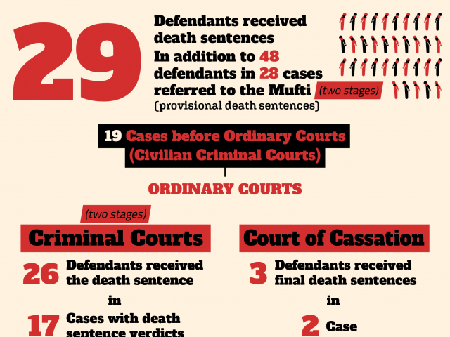 During the month of January, Egyptian courts issued death sentences to 29 defendants in 19 cases. Among them, 3 were issued final verdicts that could not be appealed. Additionally, 48 defendants' papers were referred to the Mufti in 28 other cases.