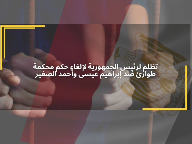 تقدم محامو المبادرة المصرية للحقوق الشخصية بتظلم إلى رئيس الجمهورية عبد الفتاح السيسي- بصفته الحاكم العسكري في ظل حالة الطوارئ المفروضة منذ أربعة أعوام- ضد الحكم الصادر من محكمة أمن الدولة طوارئ بحق كل من: إبراهيم عيسى إبراهيم وأحمد محمد الصغير بالحبس خمس سنوات مع الشغل وغرامة 100 ألف جنيه لكل منهما بتهمة المشاركة في تجمهر لم يقع من الأساس، وبعد محاكمة شابتها مخالفات قانونية جسيمة وانتهاكات لأبسط حقوق المتهمين في المحاكمة المنصفة.
