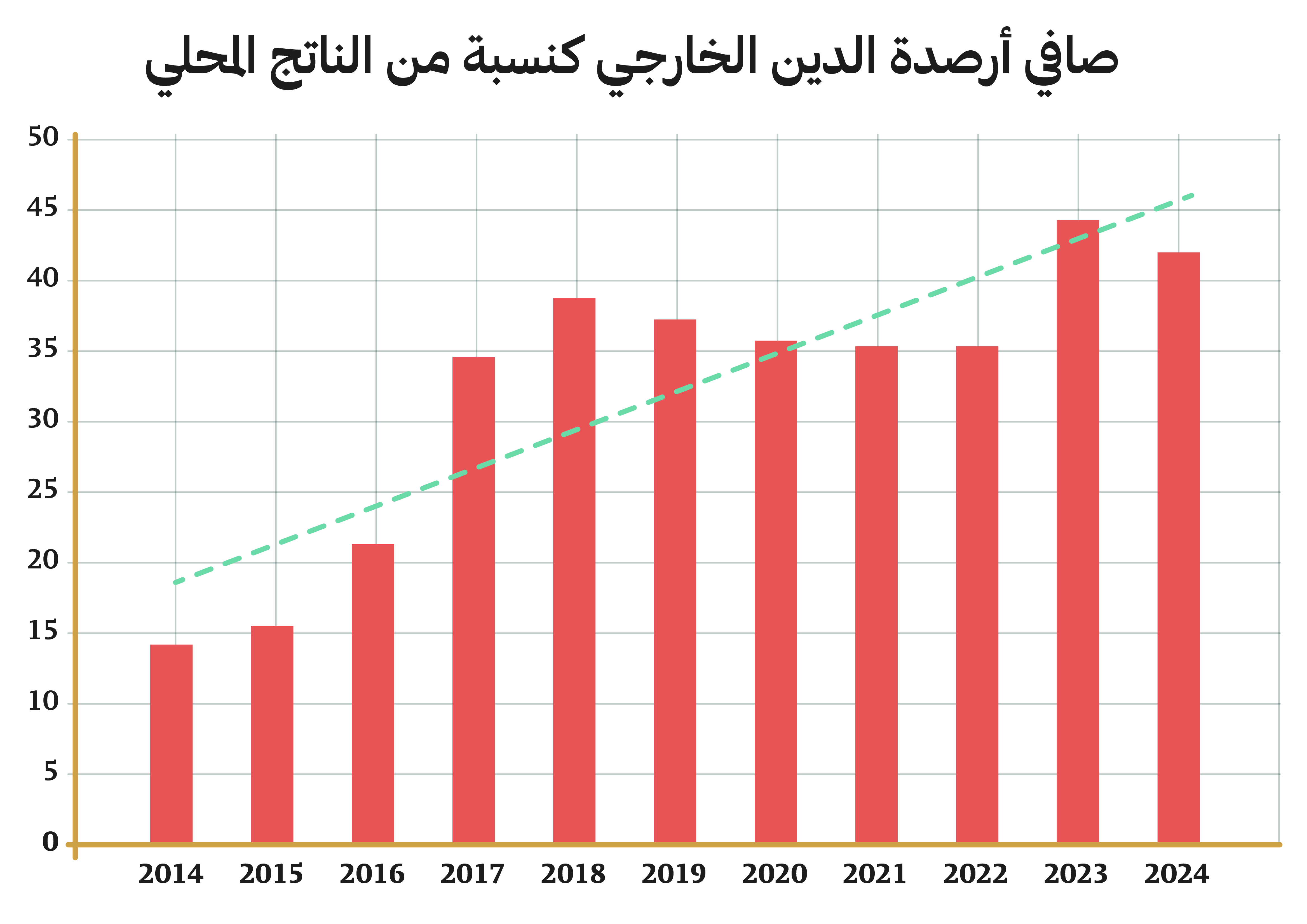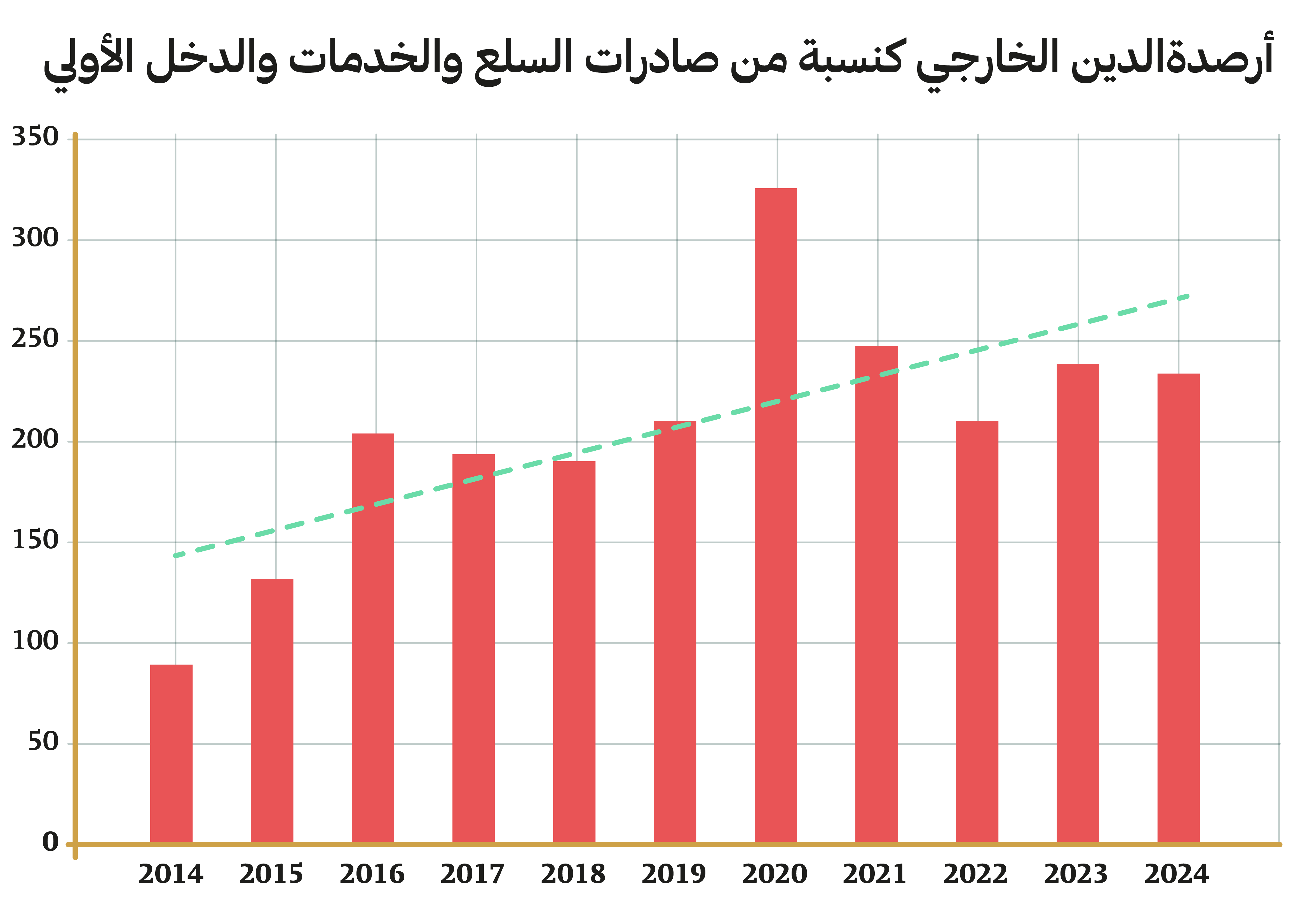 خلال السنوات العشر الماضية، ارتفعت نسبة الدين الخارجي لإجمالي الصادرات والدخل الأساسي بما يقرب 88٪ إلى 232٪. وعلى الرغم من الانخفاض عن لحظة الذروة في 2020 إلا أن الرقم ما زال مرتفعًا بشكل واضح. ويمكن التأكيد على ذلك من خلال النظر لرقم خدمة الديون السنوية كنسبة من الصادرات، والذي ارتفع من 12.6٪ في 2014 إلى ما يقرب من 49٪ في 2024.