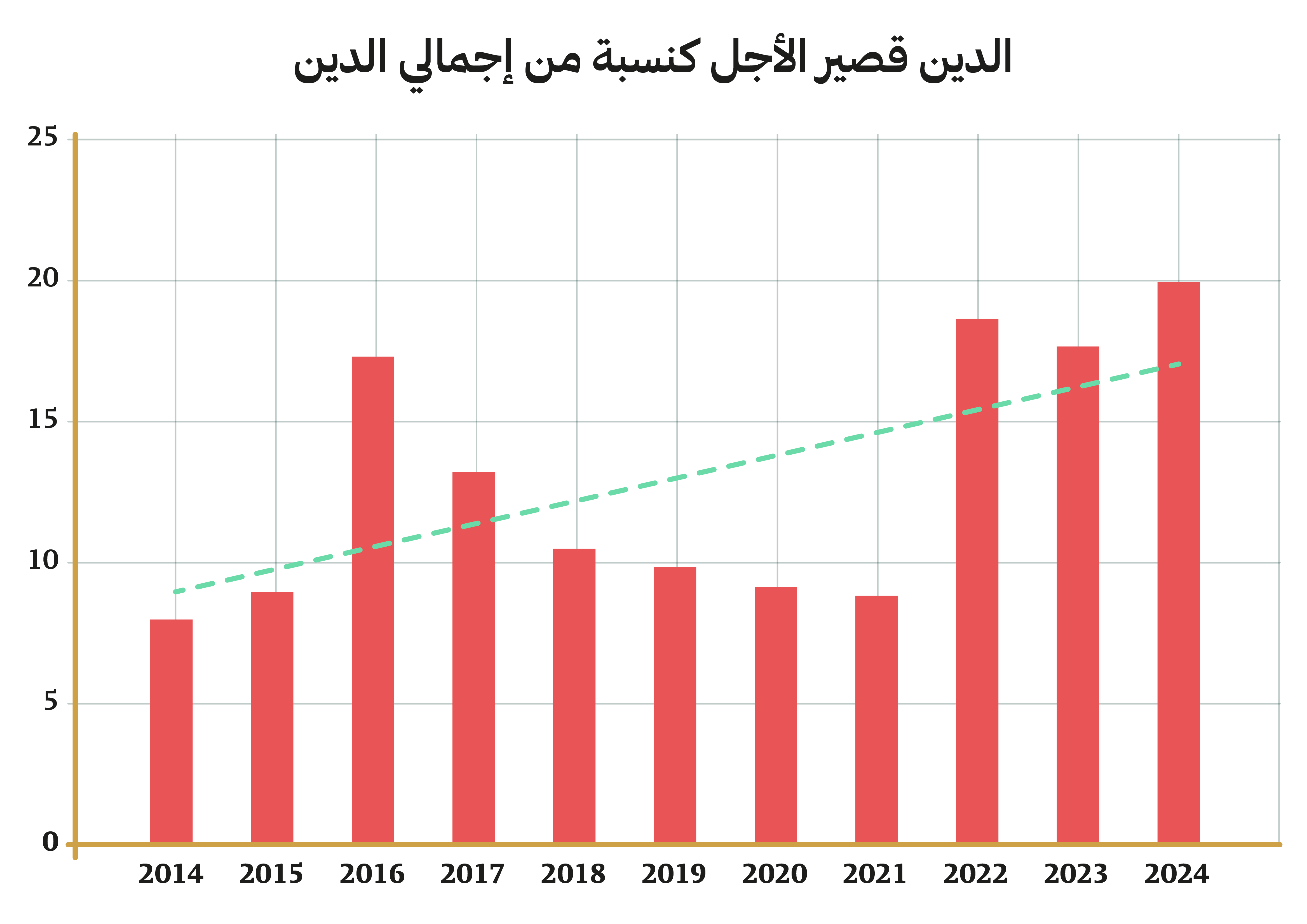 يمكن رؤية نفس الاتجاه السلبي لزيادة الديون قصيرة المدي، وتأثير ذلك على استدامة الدين الخارجي، بالنظر لمؤشرات أخرى، مثل نسبة الدين الخارجي قصير الأجل لإجمالي الدين الخارجي، والتي ارتفعت من 7.9٪ في 2014 إلى 19.8٪ في 2024. ويجعل ذلك خُمس الديون المصرية الخارجية مطالبة بالسداد خلال سنة أو أقل، وهو ما يعكس استمرار الضغوط التمويلية الناتجة عن مشكلات في هيكل الاقتراض نفسه.