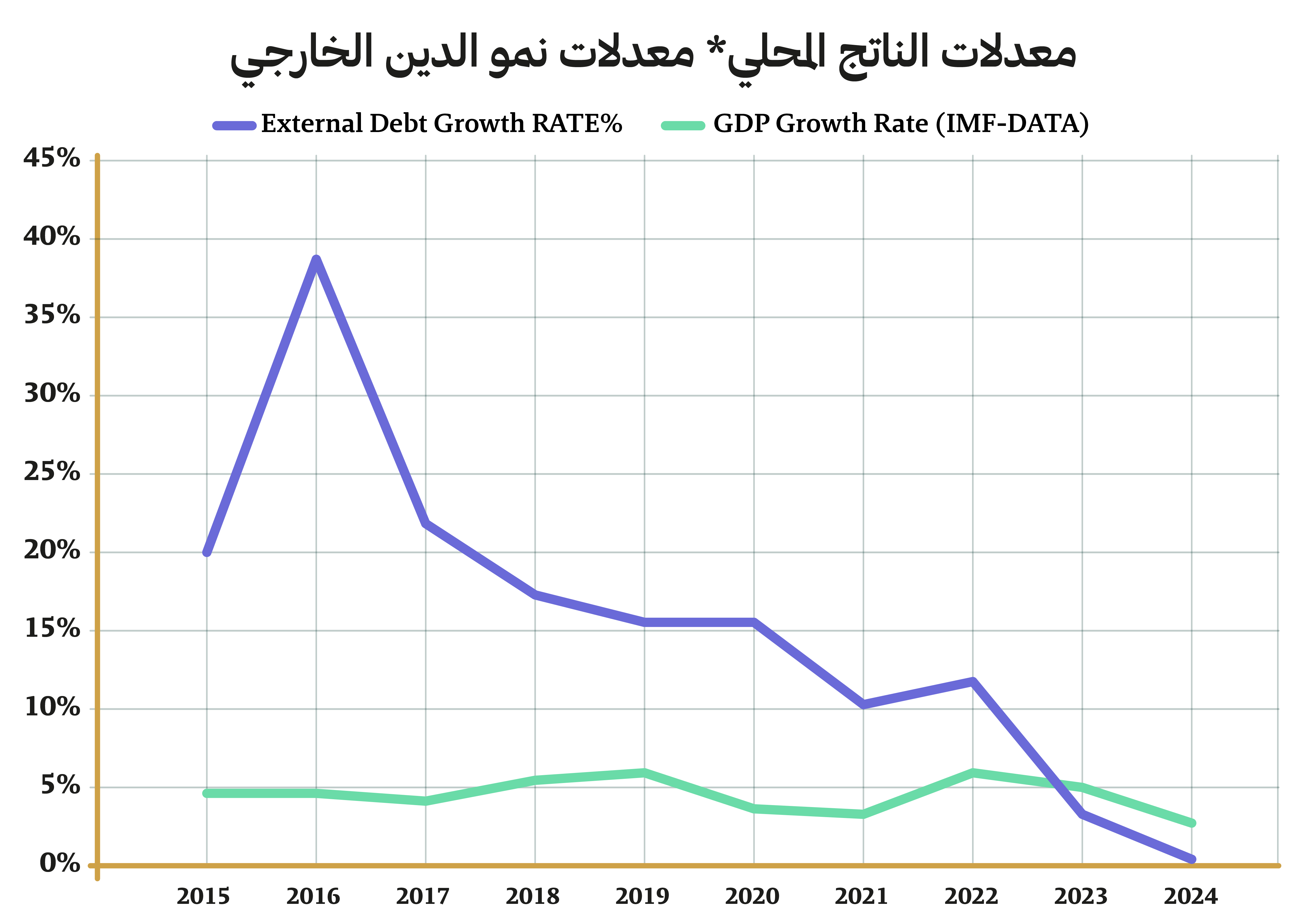 من الرسم السابق يمكن أن نلحظ أنه وخلال السنوات العشر الماضية تقريبًا كان معدل نمو الديون أعلى بكثير من معدلات نمو الناتج المحلي، ولم يتساو المعدلان سوي في 2023 حين دخلت مصر في الأزمة ووجدت صعوبة في الوصول للتمويل من أسواق الديون الدولية. وفي العام التالي انخفض معدل نمو الدين ليصبح أقل من معدل نمو الاقتصاد، لكن ذلك حدث بسبب التأثيرات على مستوى السيولة من خلال رأس الحكمة، والتي خفضت الدين الخارجي قبل أن يعود سريعًا للارتفاع كما أسلفنا.