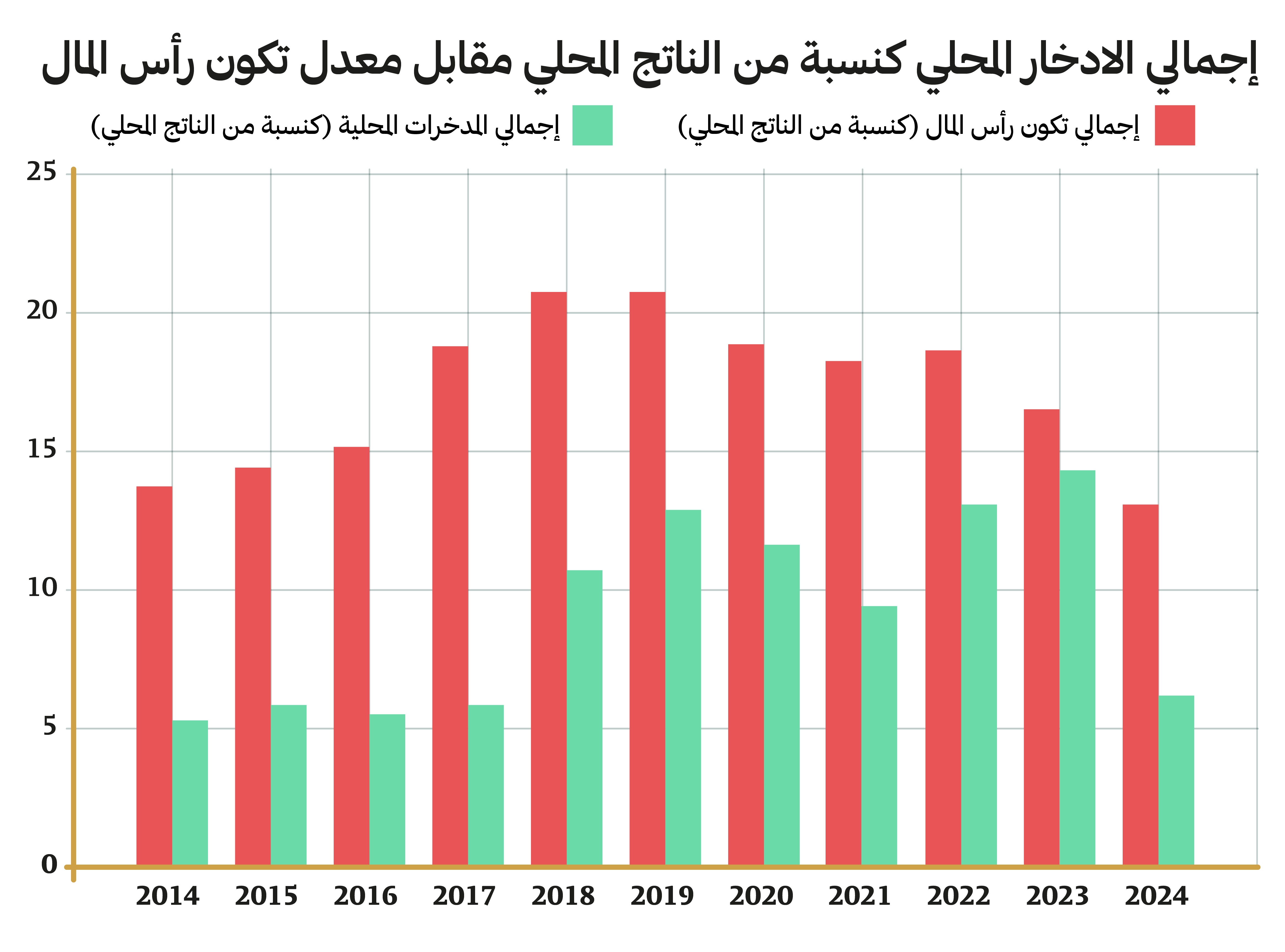 يوضح الشكل التالي الفارق الواضح بين معدل تكون رأس المال كنسبة من الناتج المحلي، والذي يعد مؤشرًا يقيس نسبة الناتج المحلي التي يعاد استثمارها في الأصول الرأسمالية بدلا من أن تستهلك، وهو معبر عن معدل الاستثمار الكلي في الاقتصاد، وعلى الجانب الأخر إجمالي معدل الادخار الوطني: